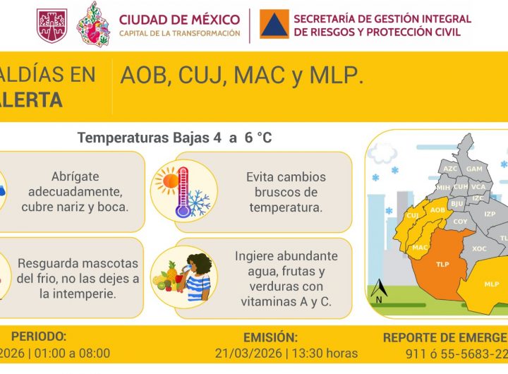 CDMX activa alerta por bajas temperaturas en varias alcaldías Metrópoli CDMX activa alerta por bajas temperaturas en varias alcaldías Redaccion 22 de marzo de 2026 La Secretaría de Gestión Integral de Riesgos y Protección Civil informó la activación de alerta naranja y...Leer Más